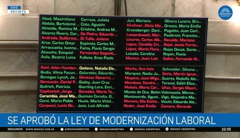 El oficialismo consiguió este jueves la sanción definitiva de la reforma laboral en el Senado y anotó un nuevo triunfo político para la gestión de Javier Milei. La iniciativa fue aprobada con 42 votos a favor, 28 negativos y dos abstenciones, luego de una jornada atravesada por manifestaciones en las inmediaciones del Congreso.