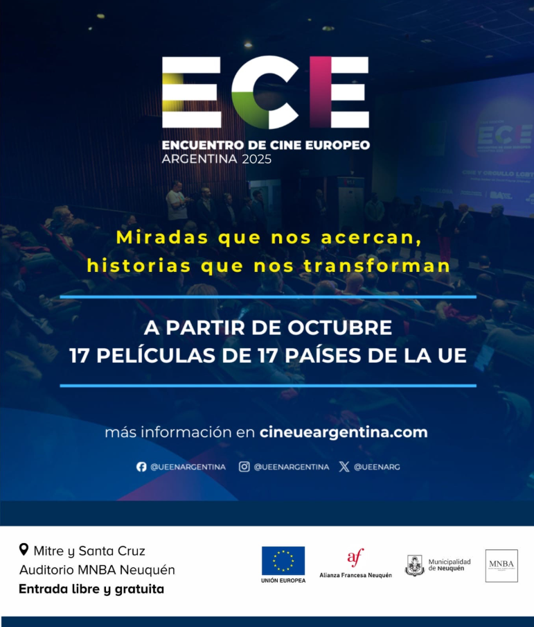 Del 2 al 8 de octubre, el Auditorio del Museo Nacional de Bellas Artes (MNBA) será sede en Neuquén de la XXI edición del Encuentro de Cine Europeo en Argentina (ECE 2025), con entrada libre y gratuita. La propuesta incluye 17 películas de 17 países europeos, que se proyectarán diariamente a las 19 horas, con funciones simultáneas en otras nueve ciudades del país.