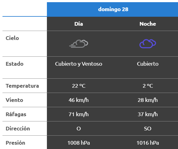 En la madrugada, la temperatura rondará los 12 grados bajo un cielo parcialmente nublado, con ráfagas de hasta 50 km/h. Durante la mañana, el termómetro marcará 15 grados, con vientos entre 32 y 41 km/h y ráfagas cercanas a los 60 km/h.