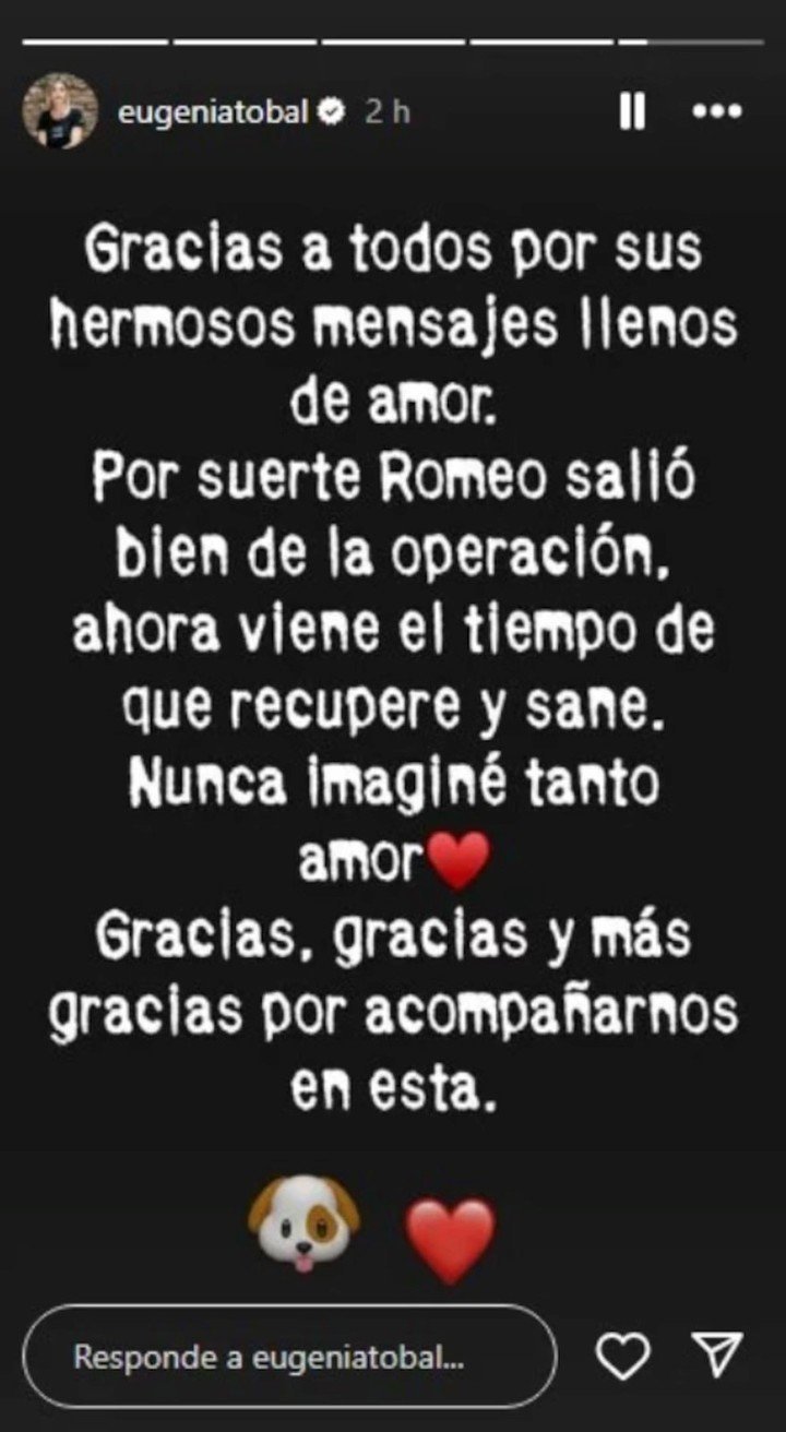 Tras la intervención, Eugenia compartió la buena noticia. Romeo salió bien del quirófano, comenzando ahora la etapa de rehabilitación, que requiere paciencia y cuidados constantes.