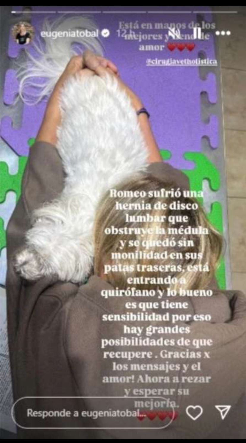 La actriz Eugenia Tobal vive horas de angustia mientras acompaña a su perro Romeo, su compañero desde hace más de diez años, en un complejo proceso de recuperación. El animal sufrió una hernia lumbar que afectó la movilidad de sus patas traseras y requirió operación de urgencia.
