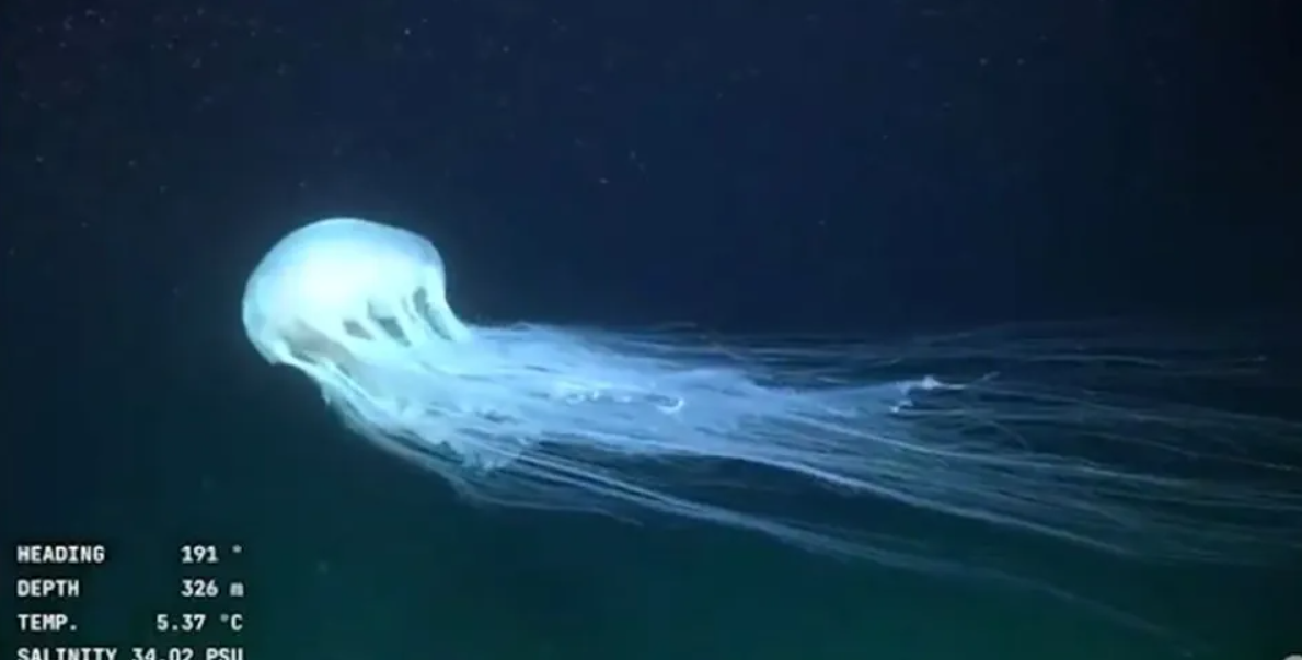 • Una gran medusa blanca, también conocida como aguaviva, con tentáculos que se mecen al ritmo de las corrientes.