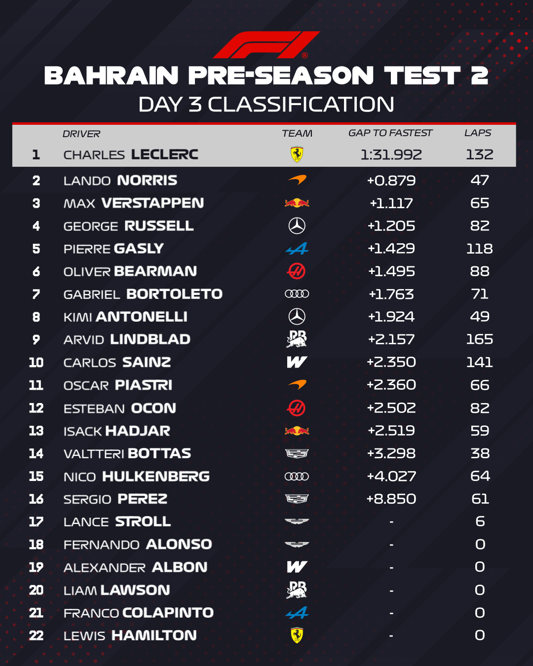 Detrás se ubicaron Lando Norris con McLaren F1 Team (+0.879), Max Verstappen con Red Bull Racing (+1.117) y George Russell con Mercedes-AMG Petronas Formula One Team (+1.205), completando los primeros puestos entre los 16 pilotos que participaron de la jornada.