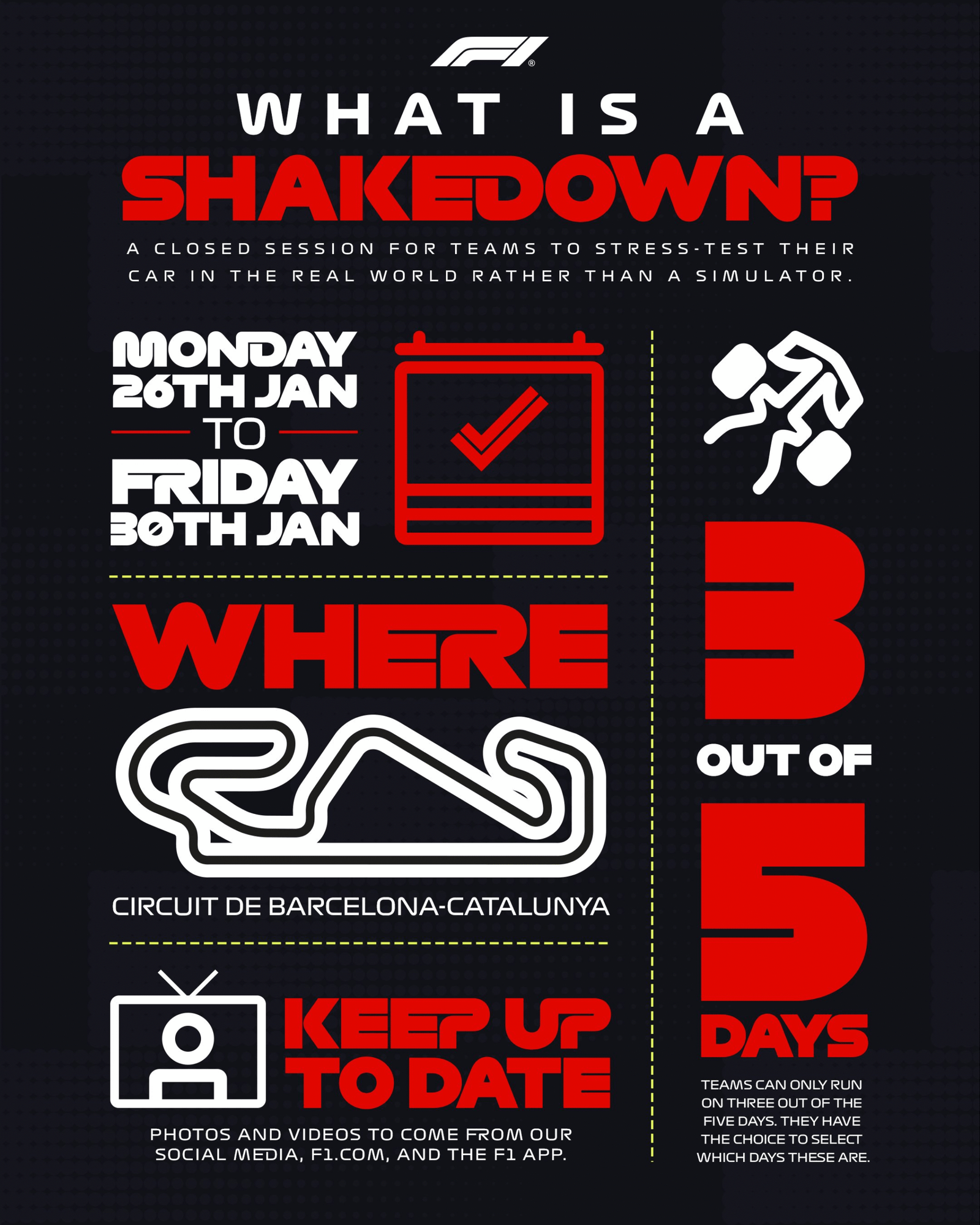 Las pruebas se desarrollarán en dos sesiones diarias, de 5:00 a 9:00 y de 10:00 a 14:00 (hora de la Argentina). Cada equipo contará con tres días de ensayos y ambos pilotos deberán compartir un solo monoplaza, lo que obliga a una administración precisa del tiempo en pista.