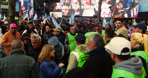 Mientras tanto, los organizadores montaban un escenario en la puerta del hotel, frente al Teatro Argentino, desde donde se espera que hablen los candidatos y el gobernador.