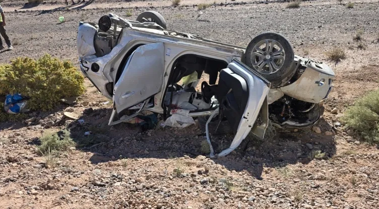 El vehículo quedó completamente volcado, con las cuatro ruedas hacia arriba y la rueda trasera derecha desprendida.