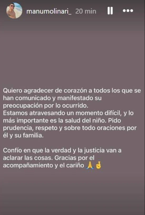 En el mismo texto, remarcó que atraviesa un momento complejo, aunque dejó en claro que la prioridad es el estado de salud del menor. “Pido prudencia, respeto y sobre todo oraciones por él y su familia”, sostuvo.