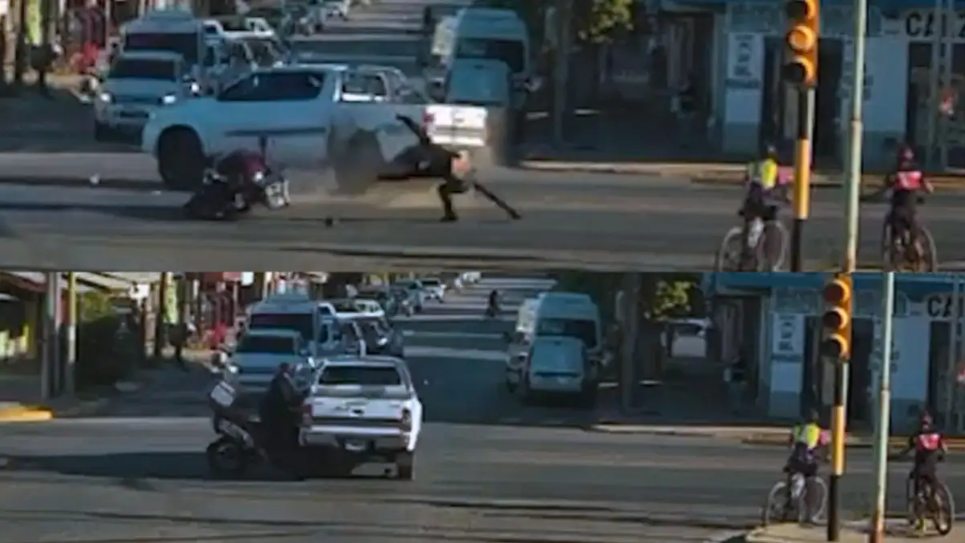 Según se observa en las imágenes, la motocicleta circulaba por la ruta cuando la camioneta avanzó para atravesarla. El motociclista no logró frenar ni esquivar el vehículo y el impacto fue directo.