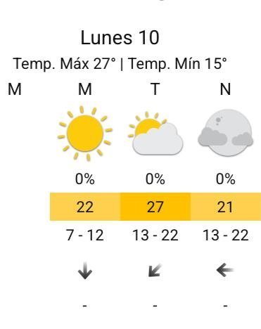 A la noche, el clima rondará los 21 grados, mientras que los vientos serán del este y soplarán a una velocidad de entre 13 y 22 kilómetros por hora. La probabilidad de lluvia estaría en el orden del por ciento para esta franja del día.