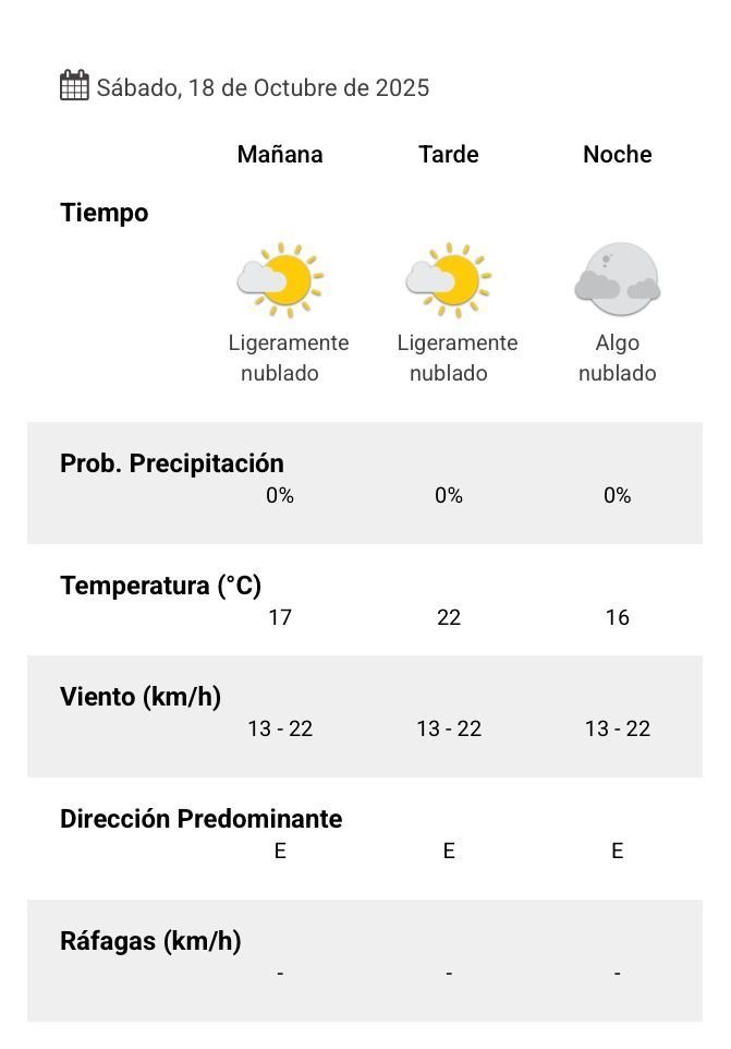 El parte del servicio meteorológico prevé que para después del mediodía el cielo estará ligeramente nublado y los vientos del sector este tendrán velocidades estimadas entre 13 y 22 km/h. La temperatura pronosticada sería de 22 grados.