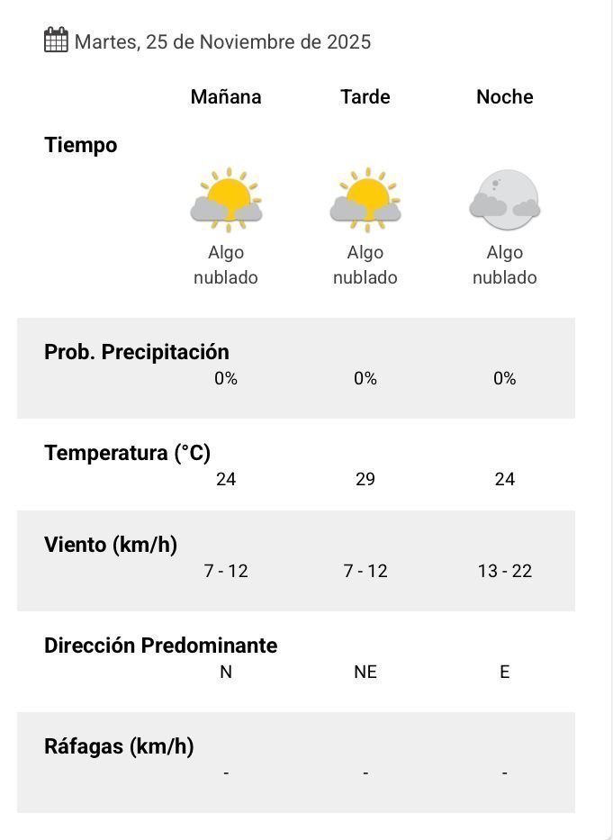 El parte del servicio meteorológico prevé que para después del mediodía el cielo estará algo nublado y los vientos del sector este tendrán velocidades estimadas entre 7 y 12 km/h. La temperatura pronosticada sería de 29 grados.