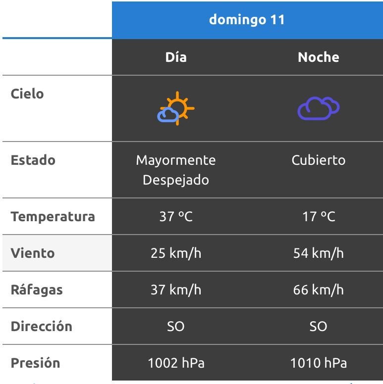 El parte del servicio meteorológico prevé que para después del mediodía el cielo estará parcialmente nublado y los vientos del sector oeste tendrán velocidades estimadas de entre 32 y 41 km/h. La temperatura pronosticada sería de 33 grados.