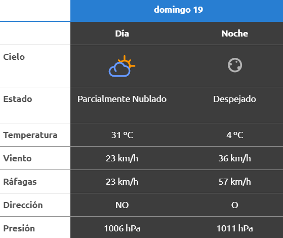 El parte del servicio meteorológico prevé que para después del mediodía el cielo estará parcialmente nublado y los vientos del sector noroeste tendrán velocidades estimadas de entre 32 y 41 km/h. La temperatura pronosticada sería de 28 grados.