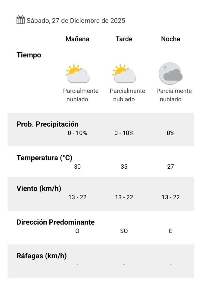 De acuerdo al parte del Servicio Meteorológico Nacional, el clima presenta una probabilidad de lluvia de el 10 por ciento, y los vientos del noreste correrán a una velocidad de entre 13 y 22 kilómetros por hora. La humedad sería del 77 por ciento, y la visibilidad sería buena.