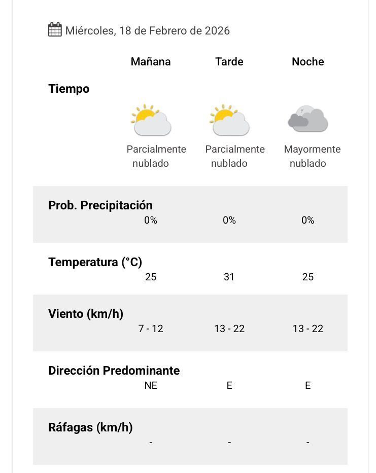 De acuerdo al parte del Servicio Meteorológico Nacional, el clima se presentaría sin lluvias, y los vientos del noreste correrán a una velocidad de entre 7 y 12 kilómetros por hora. La humedad sería del 92 por ciento, y la visibilidad sería buena.