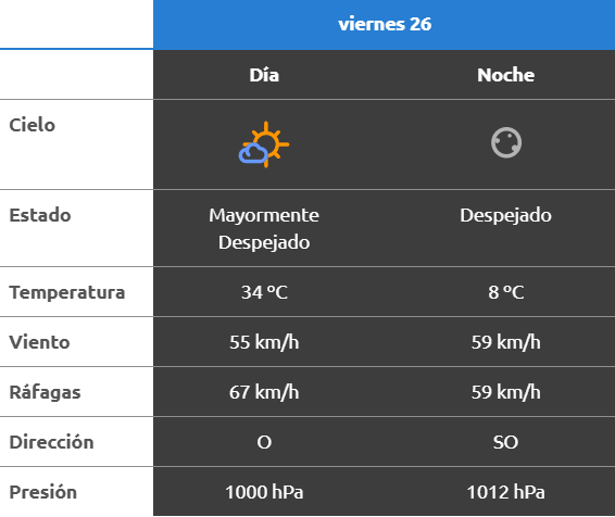 El parte del servicio meteorológico prevé que para después del mediodía el cielo estará ventoso y los vientos del sector sudoeste tendrán velocidades estimadas de entre 51 y 59 km/h. La temperatura pronosticada sería de 33 grados.