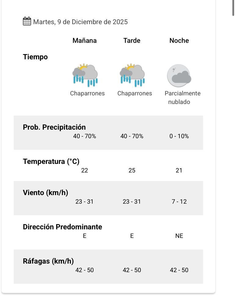 El parte del servicio meteorológico prevé que para después del mediodía el cielo estará con chaparrones y los vientos del sector este tendrán velocidades estimadas entre 23 y 31 km/h. La temperatura pronosticada sería de 23 grados.