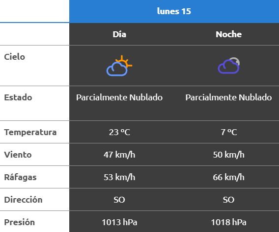 De acuerdo al parte del Servicio Meteorológico Nacional, el clima se presentaría sin lluvias, y los vientos del sudoeste correrán a una velocidad de entre 42 y 50 kilómetros por hora. La humedad sería del 47 por ciento, y la visibilidad sería buena.
