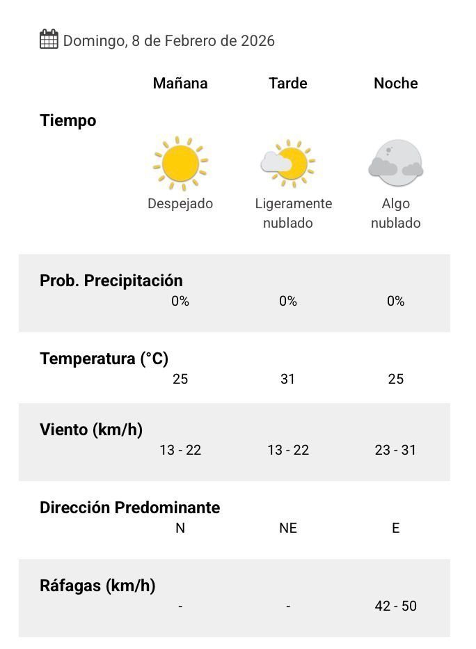 De acuerdo al parte del Servicio Meteorológico Nacional, el clima se presentaría sin lluvias, y los vientos del norte correrán a una velocidad de entre 13 y 22 kilómetros por hora. La humedad sería del 28 por ciento, y la visibilidad sería buena.