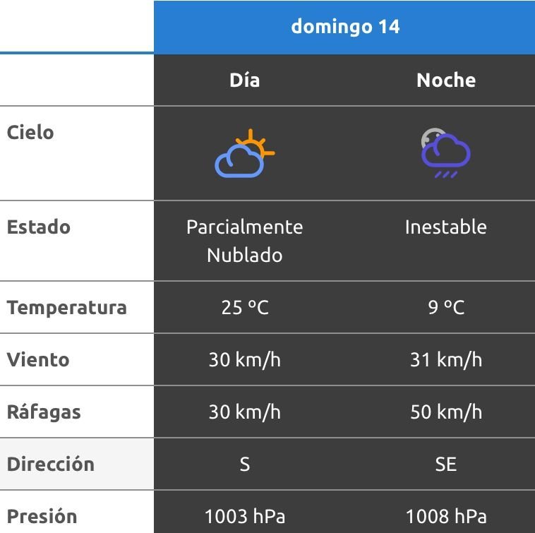 El parte del servicio meteorológico prevé que para después del mediodía el cielo estará mayormente nublado y los vientos del sector sudoeste tendrán velocidades estimadas entre 32 y 41 km/h. La temperatura pronosticada sería de 23 grados.