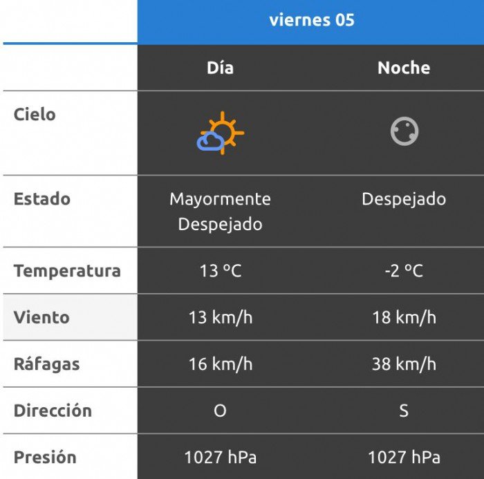 El parte del servicio meteorológico prevé que para después del mediodía el cielo estará despejado y los vientos del sector norte tendrán velocidades estimadas entre 13 y 22 km/h. La temperatura pronosticada sería de 10 grados.