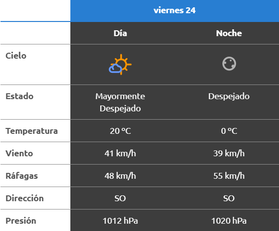 El parte del servicio meteorológico prevé que para después del mediodía el cielo estará parcialmente nublado y los vientos del sector sudoeste tendrán velocidades estimadas de entre 32 y 41 km/h. La temperatura pronosticada sería de 19 grados.