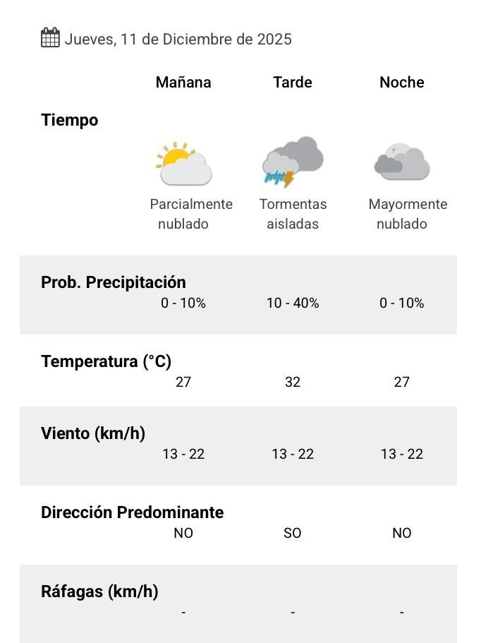 De acuerdo al parte del Servicio Meteorológico Nacional, el clima presenta una probabilidad de lluvia de el 10 por ciento, y los vientos del noroeste correrán a una velocidad de entre 13 y 22 kilómetros por hora. La humedad sería del 92 por ciento, y la visibilidad sería buena.