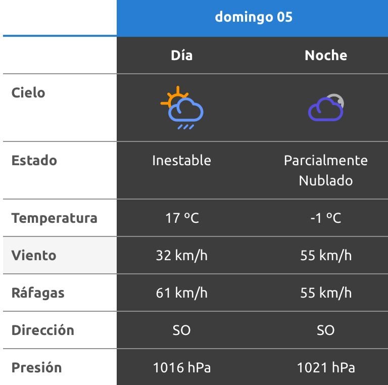 A la noche, el clima rondará los 13 grados, mientras que los vientos serán del sur y soplaran a una velocidad de 23 y 31 kilómetros por hora. La probabilidad de lluvia estaría en el orden del 10 por ciento para esta franja del día.