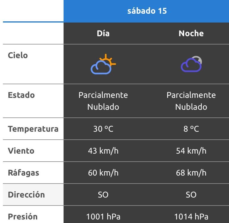 El parte del servicio meteorológico prevé que para después del mediodía el cielo estará mayormente nublado y los vientos del sector sudoeste tendrán velocidades estimadas entre 32 y 41 km/h. La temperatura pronosticada sería de 32 grados.