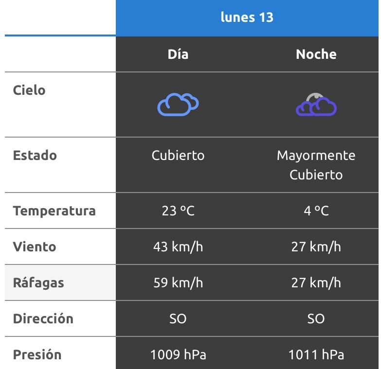 El parte del servicio meteorológico prevé que para después del mediodía el cielo estará parcialmente nublado y los vientos del sector sudoeste tendrán velocidades estimadas entre 23 y 31 km/h. La temperatura pronosticada sería de 23 grados.