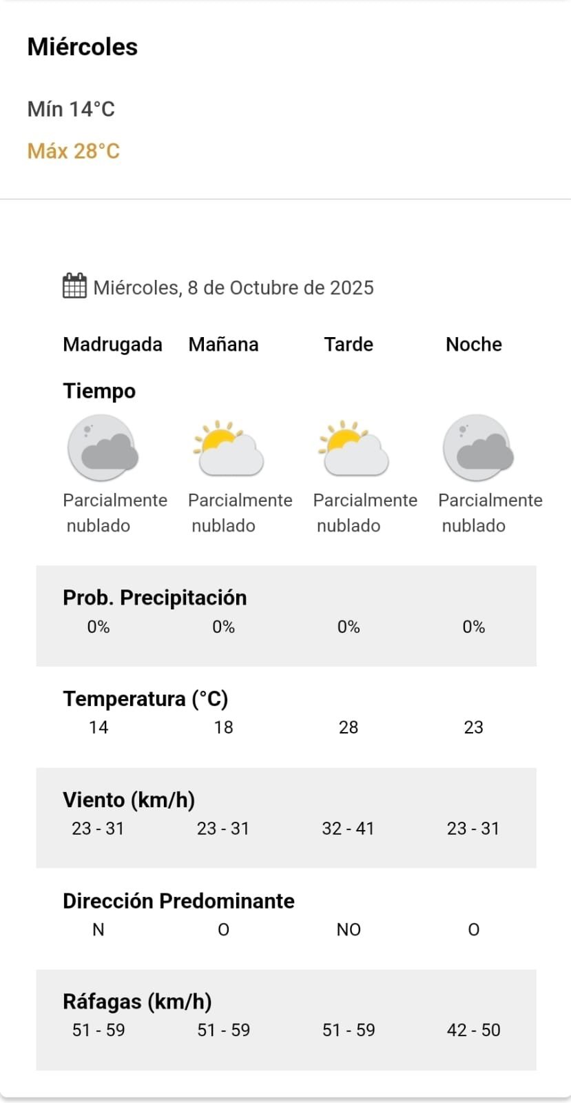 El parte del servicio meteorológico prevé que para después del mediodía el cielo estará parcialmente nublado y los vientos del sector noroeste tendrán velocidades estimadas de entre 32 y 41 km/h. La temperatura pronosticada sería de 28 grados.