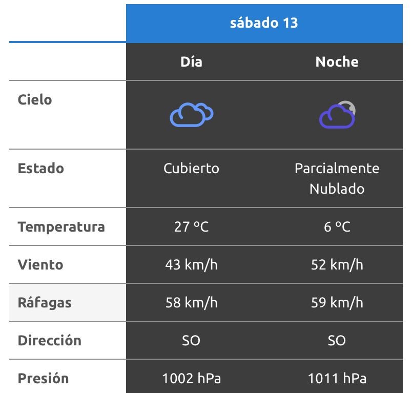 De acuerdo al parte del Servicio Meteorológico Nacional, el clima se presentaría sin lluvias, y los vientos del sudoeste correrán a una velocidad de entre 42 y 50 kilómetros por hora. La humedad sería del 22 por ciento, y la visibilidad sería buena.