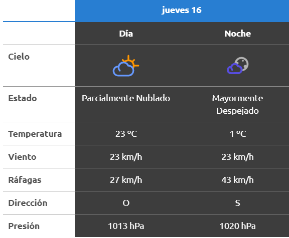 El parte del servicio meteorológico prevé que para después del mediodía el cielo estará parcialmente nublado y los vientos del sector sector oeste tendrán velocidades estimadas de entre 23 y 31 km/h. La temperatura pronosticada sería de 23 grados.