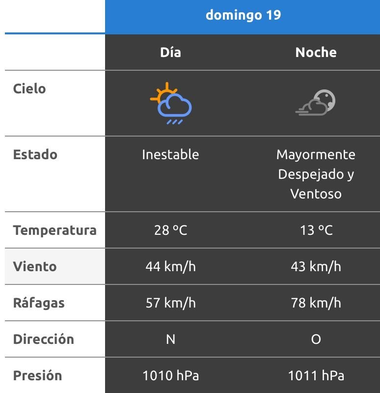 El parte del servicio meteorológico prevé que para después del mediodía el cielo estará parcialmente nublado y los vientos del sector norte tendrán velocidades estimadas entre 42 y 50 km/h. La temperatura pronosticada sería de 28 grados.