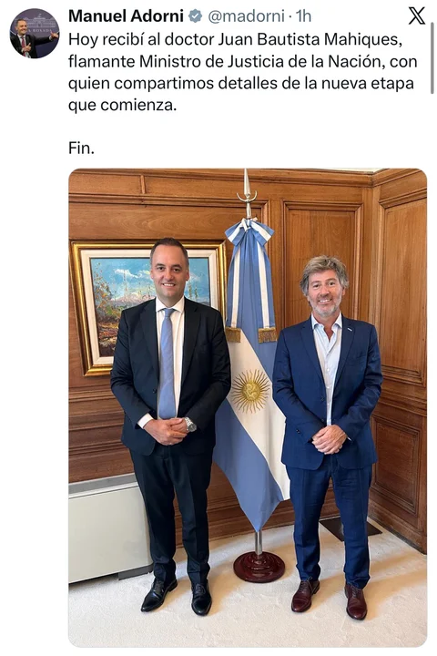 En la previa de su asunción, Mahiques mantuvo una reunión con el jefe de Gabinete, Manuel Adorni, como parte de los preparativos para su desembarco en la cartera.