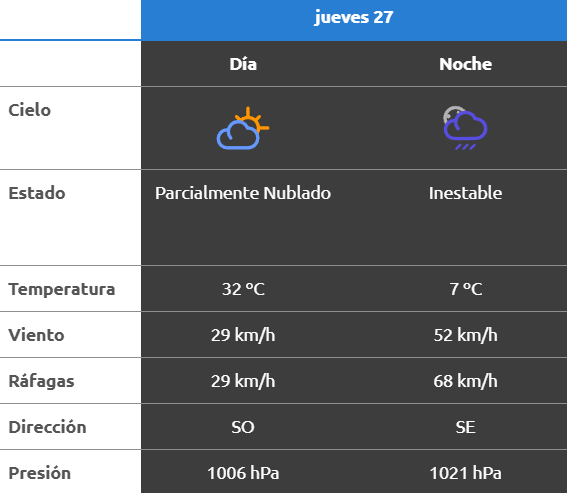 La jornada comenzará mayormente nublada, con 14°C y viento del sudoeste con ráfagas de hasta 50 km/h. Durante la mañana y la tarde el cielo estará parcialmente nublado, con temperaturas entre 16°C y 27°C y menor intensidad de viento hacia la tarde. Por la noche regresarán las ráfagas fuertes del este, que podrían llegar a 69 km/h, con 23°C.