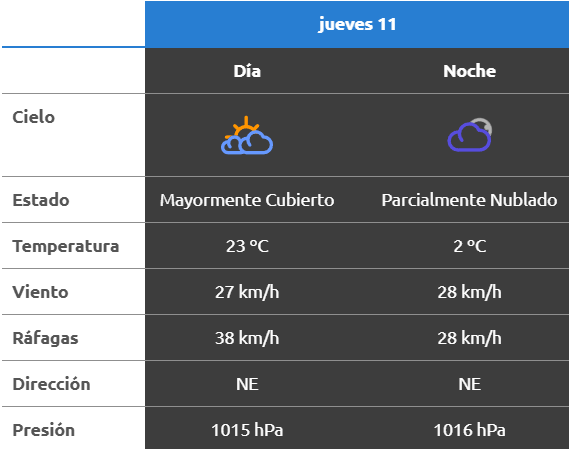La tarde traerá el cambio más notorio: 21°C de máxima, cielo mayormente nublado y vientos de 23 a 31 km/h con ráfagas intensas del norte. Hacia la noche, se mantendrá la nubosidad con 16°C y ráfagas del noroeste que conservarán su fuerza.