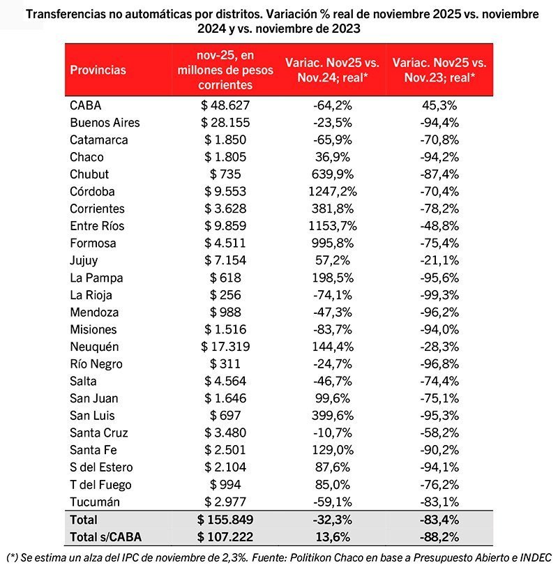 Las transferencias no automáticas del Estado Nacional a provincias y a la Ciudad Autónoma de Buenos Aires (CABA) alcanzaron $155.849 millones en noviembre, lo que representa una baja real interanual del 32,3%, según datos de la consultora Politikón Chaco. Se trata del cuarto descenso consecutivo y, en términos nominales, marca el nivel más bajo para un noviembre desde al menos 2005.