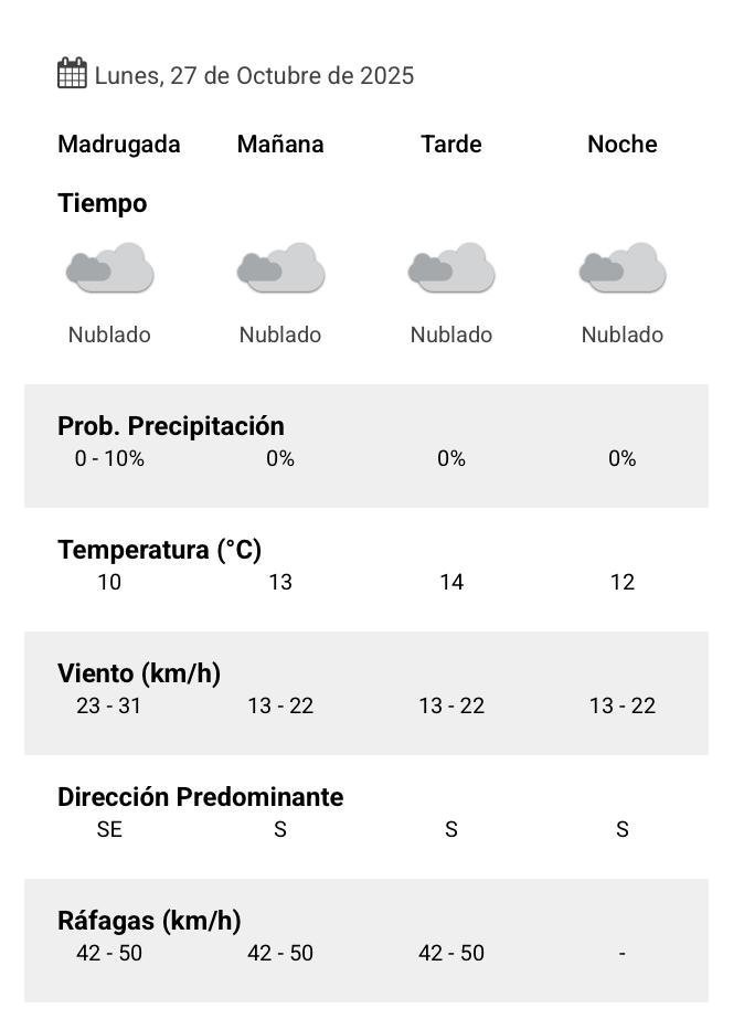 El parte del servicio meteorológico prevé que para después del mediodía el cielo estará nublado y los vientos del sector sur tendrán velocidades estimadas entre 13 y 22 km/h. La temperatura pronosticada sería de 14 grados.