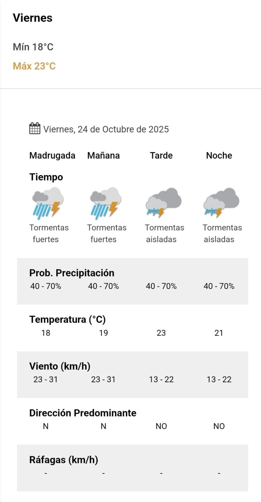De acuerdo al parte del Servicio Meteorológico Nacional, el clima presenta una probabilidad de lluvia de entre 40 y 70 por ciento, y los vientos del norte correrán a una velocidad de entre 23 y 31 kilómetros por hora. La humedad sería del 81 por ciento, y la visibilidad sería muy mala.