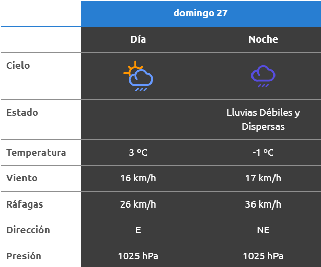 El parte del servicio meteorológico prevé que para después del mediodía el cielo estará con lluvias y nevadas y los vientos del sector noreste tendrán velocidades estimadas entre 13 y 22 km/h. La temperatura pronosticada sería de 3 grados.