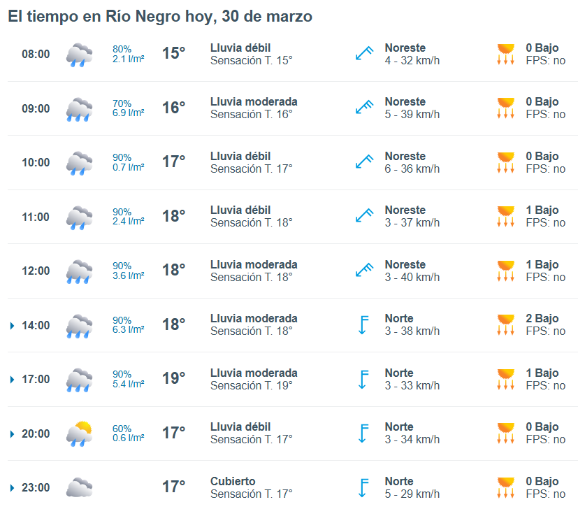 El pronóstico del tiempo para la ciudad de Río Negro, indica que hoy 30 de marzo el cielo estará con lluvias aisladas por la mañana y la temperatura rondará entre 15 grados.