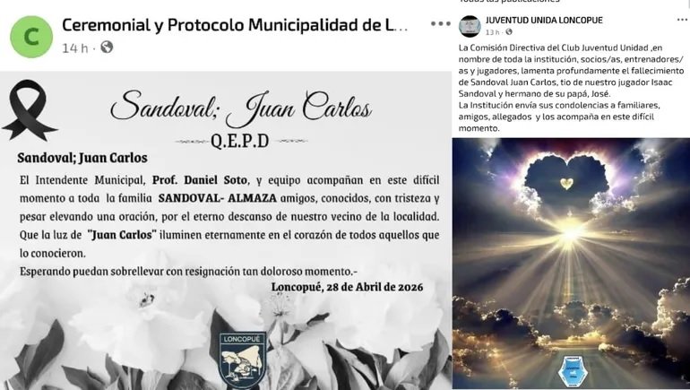 La muerte generó un fuerte impacto en Loncopué, donde Sandoval era un vecino conocido y querido. Desde el área de Ceremonial y Protocolo del municipio, el intendente Daniel Soto expresó públicamente sus condolencias a la familia Sandoval-Almaza, acompañando “con tristeza y pesar” el dolor por el fallecimiento.