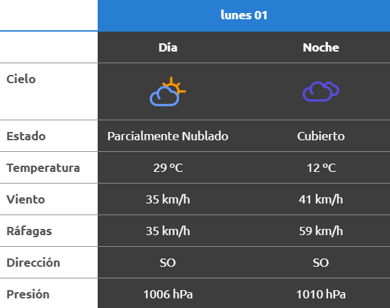 - Villa Pehuenia: mínima de 10°C, máxima cercana a 20°C, con viento leve del oeste