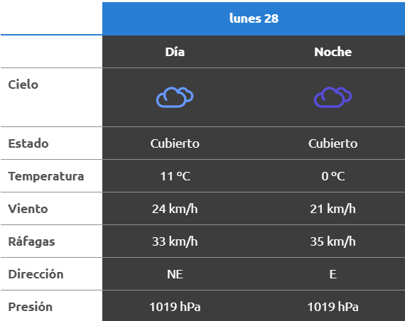 El parte del servicio meteorológico prevé que para después del mediodía el cielo estará mayormente nublado y los vientos del sector norte tendrán velocidades estimadas de entre 23 y 31 km/h. La temperatura pronosticada sería de 10 grados.