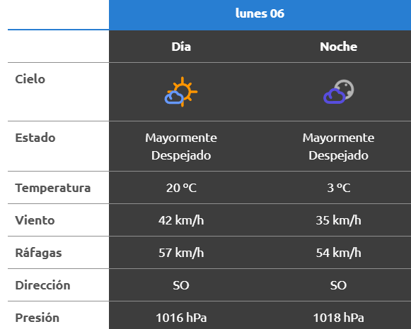 El parte del servicio meteorológico prevé que para después del mediodía el cielo estará algo nublado y los vientos del sector sudoeste tendrán velocidades estimadas de entre 32 y 41 km/h. La temperatura pronosticada sería de 22 grados.