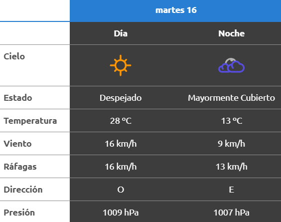 El parte del servicio meteorológico prevé que para después del mediodía el cielo estará parcialmente nublado y los vientos del sector noroeste tendrán velocidades estimadas de entre 23 y 31 km/h. La temperatura pronosticada sería de 28 grados.