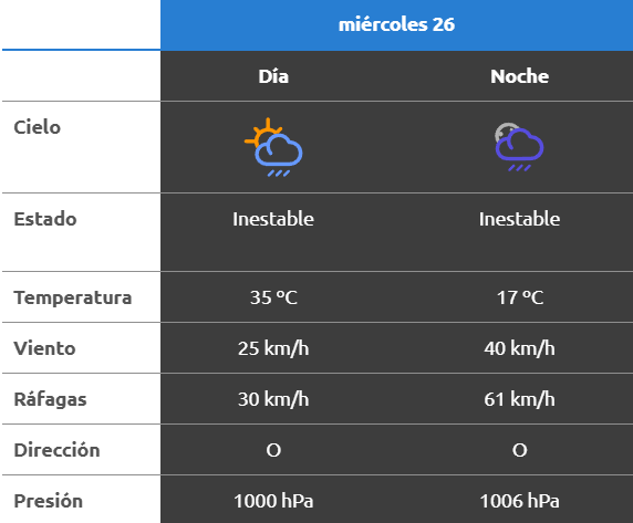 El pronóstico extendido indica que la inestabilidad se concentrará solo en la jornada del miércoles. A diferencia de otros eventos similares, el pasaje de inestabilidad no generará un descenso marcado de temperatura: la máxima rondará los 35 °C, con ráfagas que podrían alcanzar los 61 km/h.