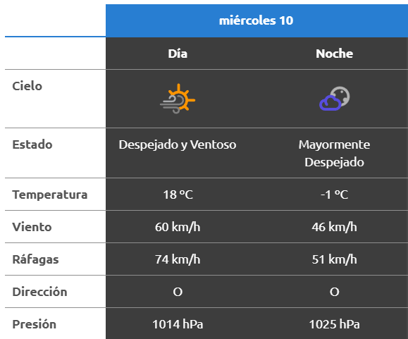 La madrugada y la mañana estarán marcadas por lluvias fuertes, temperaturas entre 6 y 7°C y vientos del oeste de hasta 69 km/h en Chos Malal. Por la tarde se esperan ráfagas de hasta 87 km/h y una máxima de 14°C. La noche mejorará con cielo algo nublado y 7°C.