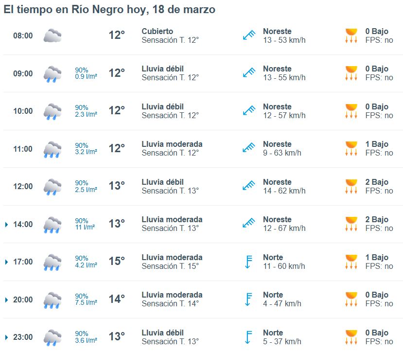 El pronóstico del tiempo para la ciudad de Río Negro, indica que hoy 18 de marzo el cielo estará con lluvias aisladas por la mañana y la temperatura rondará entre 8 grados.